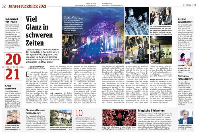 Es gab glanzvolle Premieren, ein großes Staraufgebot, tolle Ausstellungen und insgesamt ein reichhaltiges Kulturleben. Und trotzdem: Auch das Jahr 2021 war vor allem geprägt von Lockdowns, Coronabedingungen und Zugangsbeschränkungen, die sich immer wieder änderten. Denn die Kultur hat es wieder besonders hart getroffen: Das Jahr startete im Lockdown, im Februar durften Museen und Ausstellungshäuser wieder öffnen, erst am 19. Mai dann alle Kulturbetriebe. Das zwang Bühnen, wieder auf Streaming auszuweichen (die neuebuehnevillach etwa setzte konsequent darauf) oder Premieren ohne Publikum zu feiern: So konnte Salvatore Sciarrinos „Il canto s’attrista, perché“ im Februar im Stadttheater Klagenfurt nur für die Mikrofone von Ö1 und für Journalisten uraufgeführt werden – bitter für eine Produktion, die internationale Beachtung verdient hätte.