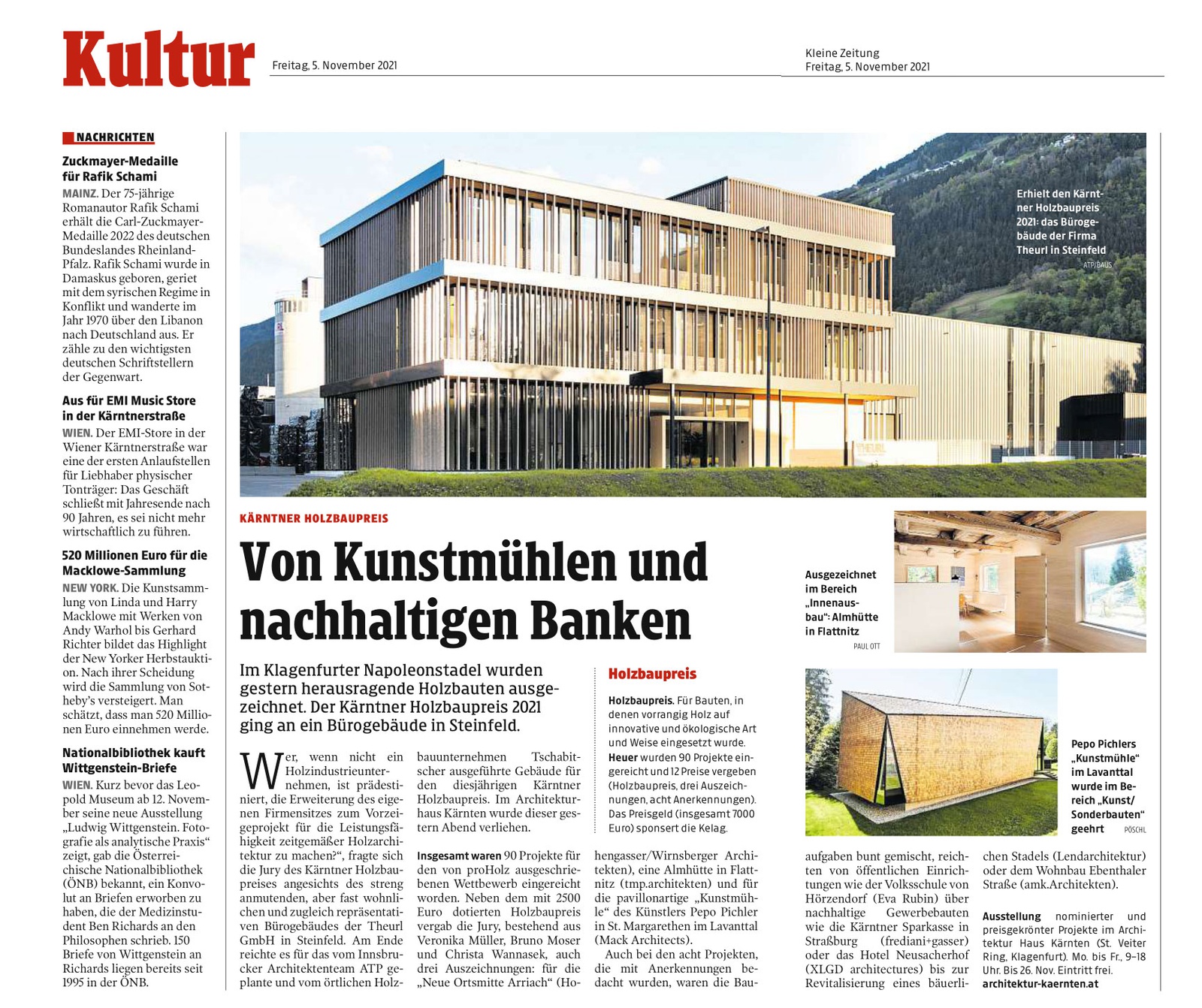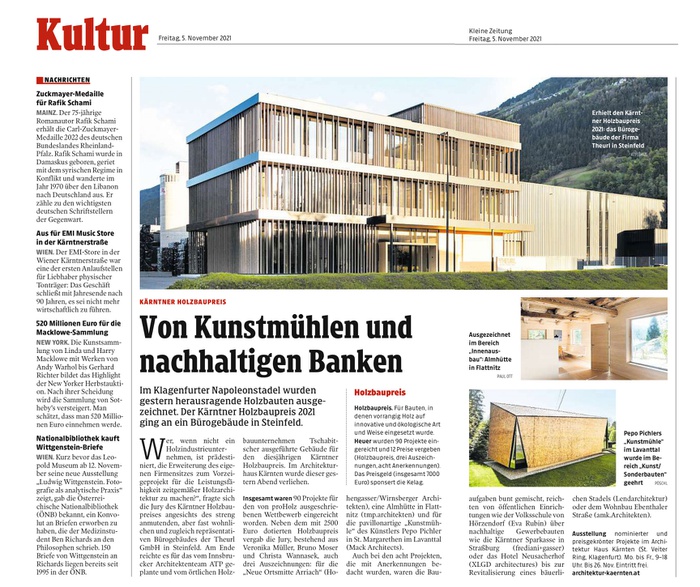 Im Klagenfurter Napoleonstadel wurden gestern herausragende Holzbauten ausgezeichnet. Der Kärntner Holzbaupreis 2021 ging an ein Bürogebäude in Steinfeld.