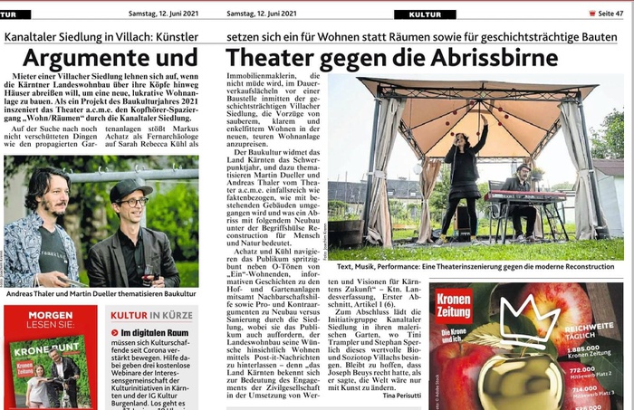 Mieter einer Villacher Siedlung lehnen sich auf, wenn die Kärntner Landeswohnbau über ihre Köpfe hinweg Häuser abreißen will, um eine neue, lukrative Wohnanlage zu bauen. Als ein Projekt des Baukulturjahres 2021 inszeniert des Theater a.c.m.e. den Kopfhörer-Spaziergang "Wohn/Räumen" durch die Kanaltal Siedlung.