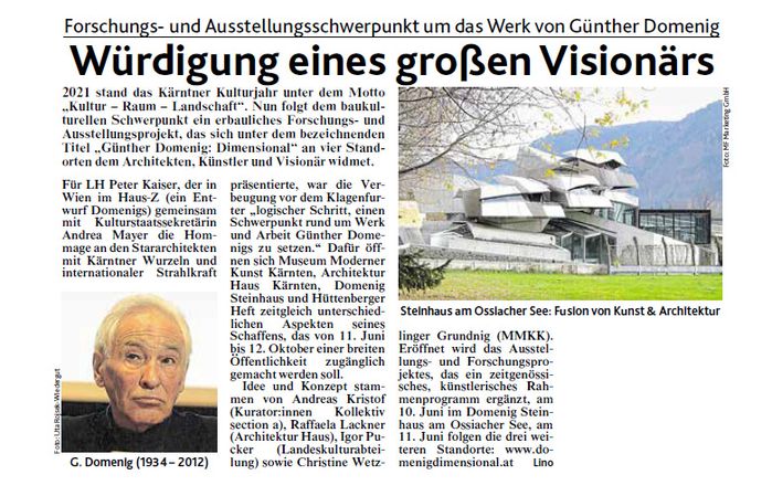 Für LH Peter Kaiser, der in Wien im Haus-Z (ein Entwurf Domenigs) gemeinsam mit Kulturstaatssekretärin Andrea Mayer die Hommage an den Stararchitekten mit Kärntner Wurzeln und internationaler Strahlkraft präsentierte, war die Verbeugung vor dem Klagenfurter „logischer Schritt, einen Schwerpunkt rund um Werk und Arbeit Günther Domenigs zu setzen.“ Dafür öffnen sich Museum Moderner Kunst Kärnten, Architektur Haus Kärnten, Domenig Steinhaus und Hüttenberger Heft zeitgleich unterschiedlichen Aspekten seines Schaffens, das von 11. Juni bis 12. Oktober einer breiten Öffentlichkeit zugänglich gemacht werden soll. Idee und Konzept stammen von Andreas Kristof (Kurator:innen Kollektiv section a), Raffaela Lackner (Architektur Haus Kärnten), Igor Pucker (Landeskulturabteilung) sowie Christine Wetzlinger Grundnig (MMKK). Eröffnet wird das Ausstellungs- und Forschungsprojektes, das ein zeitgenössisches, künstlerisches Rahmenprogramm ergänzt, am 10. Juni im Domenig Steinhaus am Ossiacher See, am 11. Juni folgen die drei weiteren Standorte: www.domenigdimensional.at