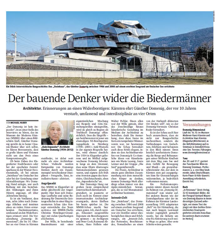 mehr als eine Architektur- Schau: Vielmehr werden Kernpunkte von Domenigs Denken durch ein Zusammenspiel verschiedener Disziplinen – Fotografie, Tanz, installative Kunst – aktiviert. Angelpunkt Das MMKK in Klagenfurt ist dabei gleichwohl der Angelpunkt: Hier lässt sich Domenigs Laufbahn und seine Bedeutung für Österreichs Geistesgeschichte in einer klug inszenierten Schau (das Konzept entwickelte das Team section.a mit MMKK-Chefin Christine Wetzlinger-Grundnig) mit vielen Querbezügen abschreiten. Der Wille, in bestehende Baustrukturen mit einer eigentümlichen Mischung aus Respekt und (Um-)Gestaltungswillen einzugreifen, wird da gleich zu Beginn als Triebkraft Domenigs offensichtlich. Dass die Eingriffe – am berühmtesten ist jener am ehemaligen NS-Reichsparteitagsgelände in Nürnberg (1998 – 2001) – tiefe Wurzeln in der eigenen Biografie hatten, wird ebenso deutlich: Der 1934 in Klagenfurt geborene und im Mölltal aufgewachsene Domenig laborierte lange an dem Umstand, dass seine Eltern überzeugte Nationalsozialisten gewesen waren, und eignete sich früh eine Aversion gegen das Autoritäre, Gleichmachende, eben das „Anpasslerische“ an. War Domenigs Hang zur großen Geste entsprechend österreichisch-kärntnerisch grundiert, so passierte er doch auch im Kontext einer internationalen Architekturavantgarde, deren Einfluss bis heute spürbar ist. Die MMKK-Schau macht hier einen guten Job, durch wenige, fokussiert ausgewählte Exponate ein Beziehungsnetz zu spinnen – zu Archigram und Peter Cook, Raimund Abraham, Hans Hollein oder Walter Pichler. Ihnen allen war der Wille gemein, über das Zweckmäßige hinaus künstlerische Gestaltung im Medium der Architektur zu betreiben. dank Die Anmerkung, dass diese Szene im Kern ein rumpelnder Männerverein war, tut heutzutage not: Die Schau formuliert auch diese Kritik elegant, indem sie den Architekturwürfen von Domenig & Co räumliche Ideen von Künstlerinnen wie Maria Lassnig, Sonia Leimer und der Gruppe „She Said“ gegenüberstellt. Die Praxis, Architektur in einem ganz direkten Zusammenhang mit dem menschlichen Körper zu denken, trennte Domenigs Werk allerdings schon immer von den rigide-männlichen Setzungen, die so viel Monumentalarchitektur bestimmt. Intensiv-Zelt Das „Steinhaus“, das Domenig zwischen 1986 und 2008 auf einem ererbten Seegrund am Ossiacher See errichtete, war ein Destillat seiner diesbezüglichen Ideen und Erfahrungen, ein „Intensiv-Zelt, das Rettendes, Beschützendes, Nomadisches an einen von der Herkunft diktierten Ort binden will“, wie es der Domenig-Vertraute Christian Reder formuliert. Es ist der Schau auch hier hoch anzurechnen, dass sie nicht nur Baugeschichte nachzeichnet, sondern die Verbindungen von Gedachtem, Erlebtem und Gebautem in den Blick nimmt: Denn letztlich synthetisierte Domenig die Berge und Behausungen seiner Mölltaler Kindheit mit dem Weg zum See und dem Gefühl für Bewegung und Musik – ein grenzüberschreitender Akt, der dem in Kärnten stets gut ausgeprägten Sinn für Grenzziehungen widerstreben, ja bedrohlich vorkommen musste. Ein Performanceprogramm nimmt diesen Anstoß im Rahmen von „Domenig Dimensional“ nun wieder auf. Bei anderen Bauten wie der Zentralsparkasse oder der im Rahmen der Kärntner Landesausstellung 1995 adaptierten „Heft“ im Ort Hüttenberg, die nun nach langem Leerstand wieder zugänglich gemacht wurde, hat die Debatte um eine Re-Aktivierung noch weite Wege zu gehen. Aber erste Schritte wären gemacht.