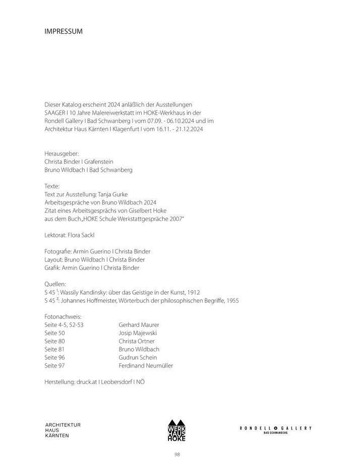 Dieser Katalog erscheint 2024 anläßlich der Ausstellungen SAAGER I 10 Jahre Malereiwerkstatt im HOKE-Werkhaus in der Rondell Gallery I Bad Schwanberg I vom 07.09. - 06.10.2024 und im Architektur Haus Kärnten I Klagenfurt I vom 16.11. - 21.12.2024
