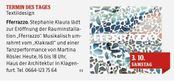Zur Eröffnung hat die Kärntner Musikformation Klakradl eingespielen, bestehend aus dem Kabarettduo RaDeschnig, sowie dem Jazz /Worldmusic Duo [:klak:]. Martina Rösler, auch eine aus Kärnten stammende Künstlerin, Tänzerin und Choreografin hat die Kunstinstallation teilweise mit einer tänzerischen Performance ergänzt. Die Laudatio zur Rauminstallation kam von Andrea Schurian.