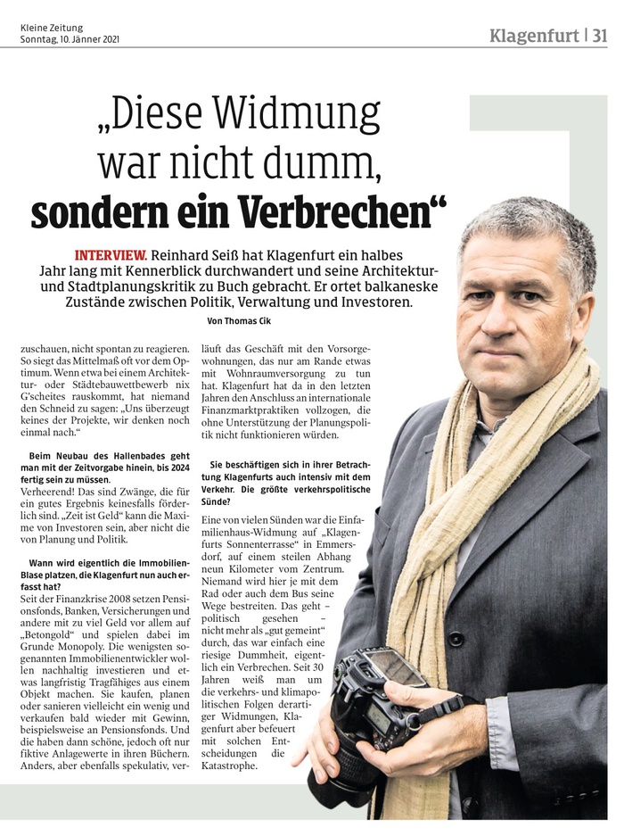 REINHARD SEISS: Klagenfurt hat, wie die meisten österreichischen Städte, eine Vielzahl an schönen, wertvollen Bauten. Das reicht von Ensembles aus dem 19. Jahrhundert bis hin zu tollen Bauten aus der Nachkriegszeit. Aber man geht nicht immer entsprechend damit um. Nehmen Sie das ehemalige Haferdepot hinter dem Bezirksgericht her. Das verfällt einfach, obwohl es großes Potenzial für viele Nutzungen hätte. Aber es gibt auch erfreuliche Beispiele, wie die alte Postgarage beim Hallenbad, wo die Wirtschaftskammer den Makerspace errichtet hat. Bei Umbau und Sanierung vieler anderen historischen Bauten hingegen fehlt es den Bauherren und ihren Architekten dagegen merklich am nötigen Gespür. Ich nenne da nur manche Dachausbauten.