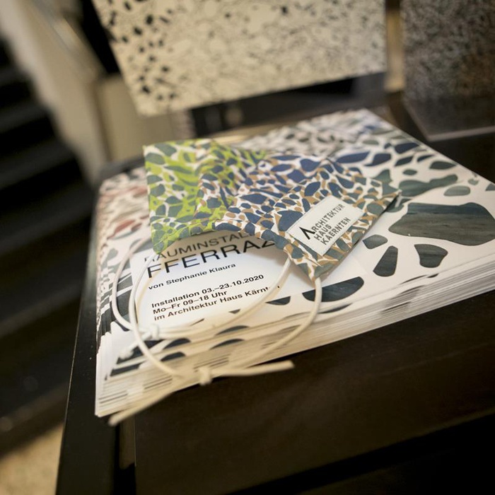 Künstlerin Stephanie Klaura entwickelte vor Ort, im Architektur Haus Kärnten in intensiver Auseinandersetzung mit dem Gebäude, ein eigenes „Architekturhaus-Textil“. Inspiriert vom Bierflaschen-Terrazzo im Foyer des Napoleonstadels produzierte sie, anhand des manuellen Siebdrucks, Stoffbahnen mit dem „FFERRAZZO Muster“.