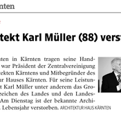 NachrufBaurat h.c., Architekt, Mag.arch. Karl MÜLLER (2.8.1932-5.1.2021) war seit 1958 als freischaffender Architekt in Klagenfurt tätig. Zahlreiche bedeutende und ortsbildprägende Schul-, Wohn- und Gewerbebauten im Land tragen seine Handschrift. Architekt Müller war langjähriger Präsident, dann Ehrenpräsident der Zentralvereinigung der ArchitektInnen Kärntens, 1992 war er federführender Mitbegründer des Architektur Hauses Kärnten und erhielt für seine Leistungen das Große Ehrenzeichen des Landes, den Landesbaupreis, den Österreichischen Holzbaupreis und andere Ehrungen. Mit Karl Müller verlieren wir einen steten Kämpfer für baukulturelle Anliegen in Kärnten.