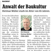 weiterlesen …Dietmar Müller hat sich als Architekturvermittler besondere Verdienste beim Aufbau und der Weiterentwicklung des Architektur Haus Kärnten erworben. Sein engagiertes Wirken im Sinne der Hebung der allgemeinen gesellschaftlichen Entstehungsbedingungen von zeitgemäßer Architektur bleibt exemplarisch. Darüber hinaus galt sein besonderes Interesse dem Thema Kunst im öffentlichen Raum. Mit Dank für seine Bemühungen und positiven Entwicklungsimpulse für die Architektur- und Kunstszene in Kärnten nehmen wir Abschied und werden ihm ein ehrendes Gedenken bewahren.