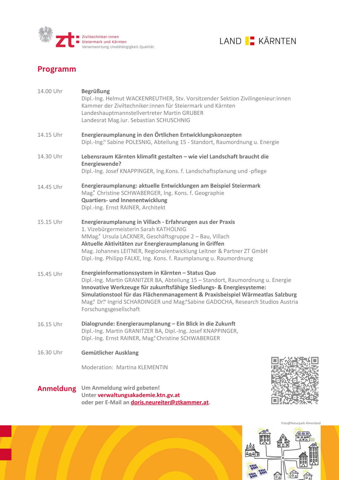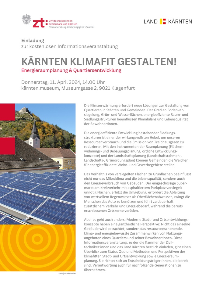 Aber es geht auch anders: Moderne Stadt- und Ortsentwicklungskonzepte haben eine ganzheitliche Perspektive: Nicht das einzelne Gebäude wird betrachtet, sondern das ressourcenschonende, klima- und energiebewusste Zusammenwirken von Nutzungsangeboten eines Quartiers und seiner Bewohner:innen. Diese Informationsveranstaltung, zu der die Kammer der Ziviltechniker: innen und das Land Kärnten herzlich einladen, gibt einen Überblick zum Status Quo und Methoden und Perspektiven der klimafitten Stadt- und Ortsentwicklung sowie Energieraumplanung. Sie richtet sich an Entscheidungsträger:innen, die bereit sind, Verantwortung auch für nachfolgende Generationen zu übernehmen.