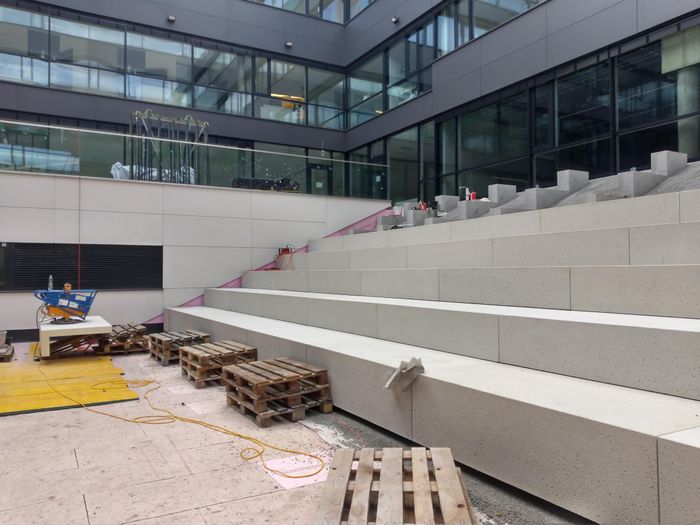 Unter der Erweiterung der Schule ist zudem eine dreigeschossige öffentliche Parkgarage situiert.