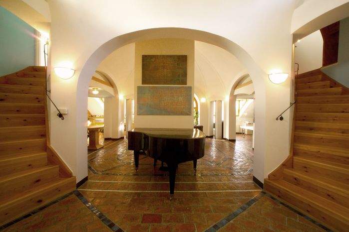 Auf engstem Raum und unter Einbeziehung von Kamin und bestehenden statischen Elementen befasst sich Rob Krier mit Archetypen – die wiederkehrenden Themen seiner Zeichnungen und Entwürfe. Leichte Niveauunterschiede, gepaart mit Einschnitten in der Dachfläche, zurückhaltende Gaupen und eine überschwengliche Geometrie tragen zum vielschichtigen Raumerlebnis bei.