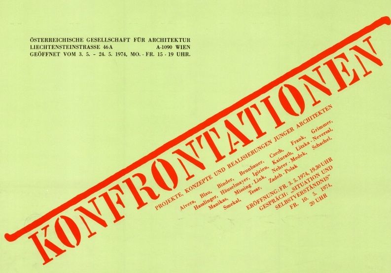 Mit Projekten von Alessandro Alverà, Luigi Blau, Binder, Wolfgang Brunbauer, Hermann Czech, Heinz Frank, Helmut Grimmer, Hasslinger, Otto Häuselmayer, IGIRIEN, Josef Kainrath, Litzka-Neversal, Dimitris Manikas, Missing Link, Nehrer/Medek, Roland Schachel, Hans Dieter Smekal, Heinz Tesar, Khosrow Djafar-Zadeh/Norbert Polak