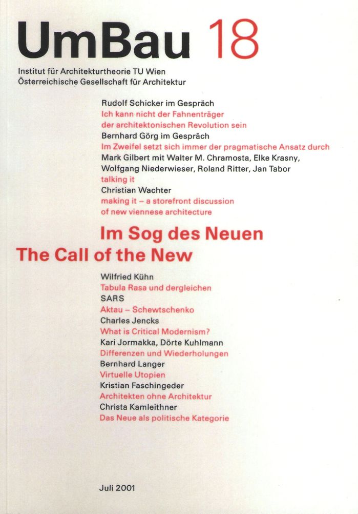 Im Sog des Neuen: Der Untertitel des vorliegenden UmBau bezieht sich nicht nur auf die Themen, die wir in dieser Ausgabe diskutieren, sondern auch auf den UmBau selbst. Sichtbare Neuerungen sind der veränderte Umschlag und der Farbteil, in dem wir ab nun regelmäßig einen Fotoessay präsentieren werden. Inhaltlich gliedert sich der neue UmBau ab nun in vier Bereiche: Einen aktuellen Teil, der sich in Interviews und Kommentaren mit den Hintergründen vor allem der österreichischen Architekturproduktion beschäftigt; den Fotoessay, in dem wir der Architekturfotographie einen eigenen Raum geben wollen; einen Bereich mit Texten, die wie bisher auf das Vortragsprogramm der Österreichischen Gesellschaft für Architektur zurückgehen; und schließlich eine Bereich zu einem vorab angekündigten Thema, dessen Texte durch einen jeweils neu zusammengestellten wissenschaftlichen Beirat ausgewählt werden.