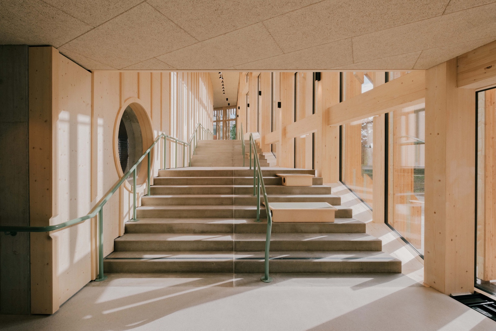 „Erwachsene verlaufen sich immer, Kinder nie“, sagt die künstlerische Leiterin Mona Jas im Entree. Die gestufte Portalöffnung gibt es an allen drei Gebäudeseiten, der umlaufende Sockel fungiert als Sitzbank im Freien. Der Lamellenvorhang der Fassade öffnet das KinderKunstLabor zur Umgebung und sorgt im Inneren für ein bewegtes Licht/Schatten-Spiel. Dass es in diesem Haus auf allen Ebenen um künstlerische Erfahrungsräume geht, ist auch auf der Spielterrasse im 3. Obergeschoss spürbar: Hier können Kinder in Höhe der Baumkronen eine textile Netzlandschaft erklimmen, die die japanische Künstlerin Toshiko Horiuchi MacAdam eigens für diesen Ort geschaffen hat. (Text: Gabriele Kaiser, erschienen in architektur aktuell 11.2024)