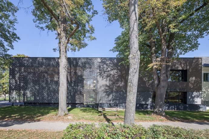Die Fassade ist mit Holzlamellen verkleidet, die je nach Betrachtungswinkel und Lichteinfall für ein anderes Erscheinungsbild sorgen. Die unterschiedlich dichte Anordnung der Latten greift die verschiedenen Funktionen im Gebäude auf und gibt zudem einen Hinweis auf die Nutzung der dahinterliegenden Räume. Darüber hinaus dienen die Holzlamellen zur Beschattung. Eine (sommerliche) Überhitzung des Gebäudes wird unter anderem dadurch verhindert und stattdessen ein Raumklima geschaffen, das den Bedürfnissen und dem Wohlbefinden der unterschiedlichen Nutzer:innen gleichermaßen Rechnung trägt.
