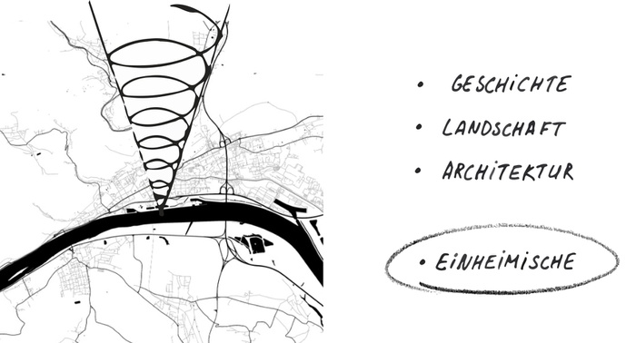 Interdisziplinär agierend wird Ekaterina Schneidmüller mittels historischer Analysen, grafischer Skizzen und interaktiver Workshops mit den Einwohner:innen die Beziehung zwischen Natur, Geschichte und Architektur von Krems sichtbar machen. Sie beruft sich in ihrem Zugang auch auf den von Guy-Ernest Debord formulierten Begriff der „Psychogeographie“, der untersucht, welchen Einfluss die architektonische oder geographische Umgebung auf die Wahrnehmung, das psychische Erleben und das Verhalten hat.