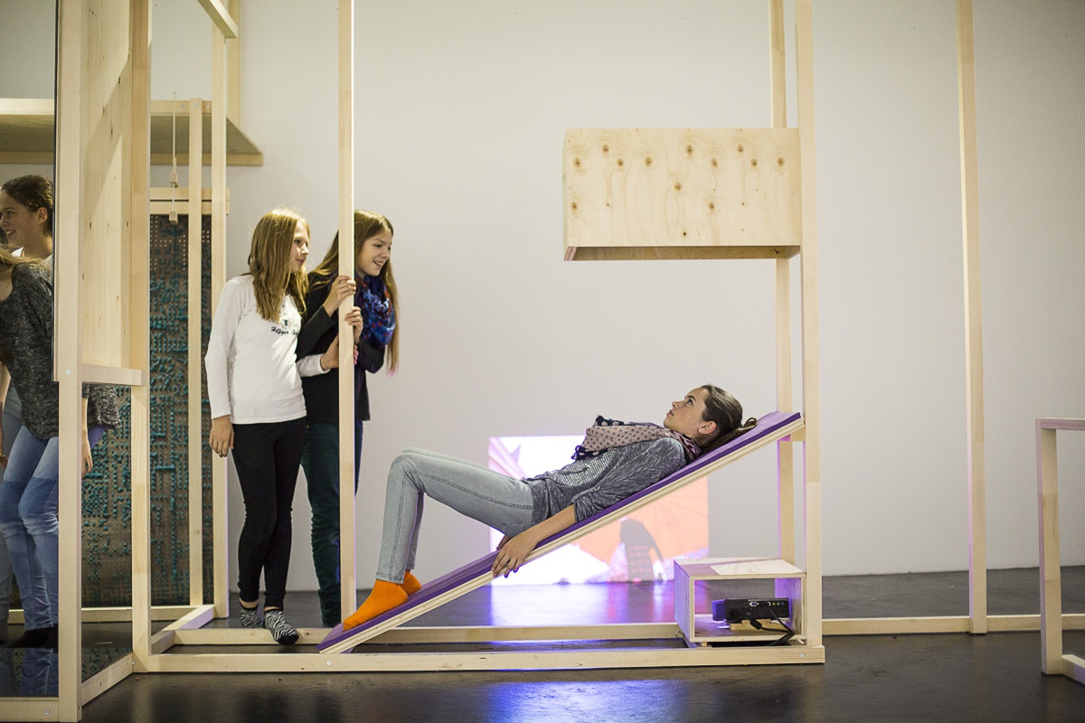 4 Raumpartitur. Mit allen Sinnen wird die Raumstruktur erkundet und die Mehrstimmig(sinnig)keit als Partitur wahrgenommen. Raum hören in der Ohrenliege, Material hören unter der Filzhaube und was passiert bei Anruf?