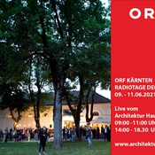 ORF RADIO KÄRNTEN RADIOTAGE (09 - 11:00 Uhr und 14 - 18.30 Uhr) Im Open-Air-Radiostudio von ORF Radio Kärnten wird drei Tage lang live aus dem Architektur Haus Kärnten gesendet. Eingeladen werden Netzwerkpartner, Baukultur-Initiativen, Architekt*innen, Vertreter*innen aus der Verwaltung und Künstler*innen. Der Freitag steht unter dem Thema "LEBEN LERNEN RAUM". Zu Wort kommen Vertreter*innen der Baukulturvermittlung in Kärnten (Architektur-Spiel-Raum-Kärnten, FH Kärnten, HTL Villach) und aktuelle Schulbauten werden durch Architekt*innen und den Nutzern vorgestellt.
