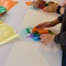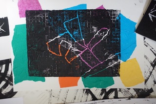 Wir suchen Farbflecke und Striche. Wir zeichnen, kleben, reißen Papier und machen Druckspuren.