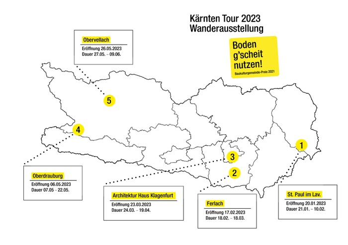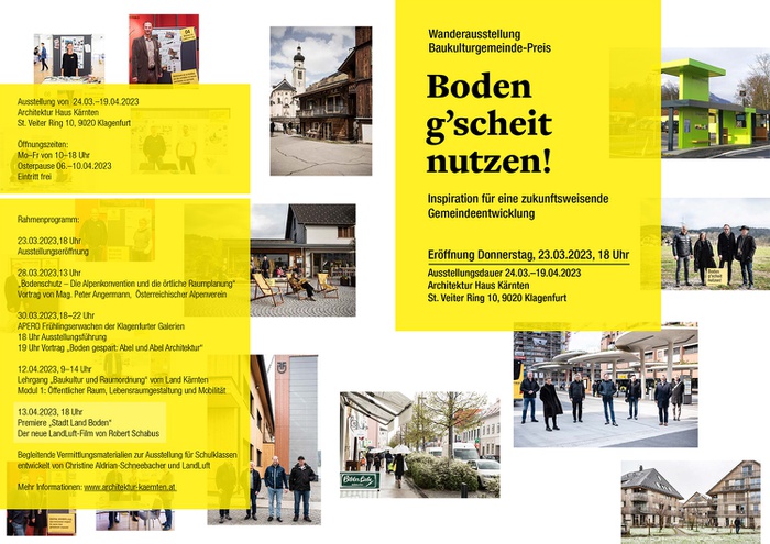 Das Architektur Haus Kärnten setzt seinen Schwerpunkt 2023/24 „Grund und Boden“ mit der Wanderausstellung „Boden g‘scheit nutzen!“ vom Verein LandLuft im März und April fort. Begleitet von einem Rahmenprogramm mit Vorträgen soll tieferes Bewusstsein auch in den Gemeinden geschaffen werden. Das Architektur Haus Kärnten wurde unter den Nominierten zum Sonderpreis für außergewöhnliches Engagement gelistet. Eingereicht wurden die Prozesse sowie Schwerpunkte zur Raumordnung in Kärnten von 2011-2021.
