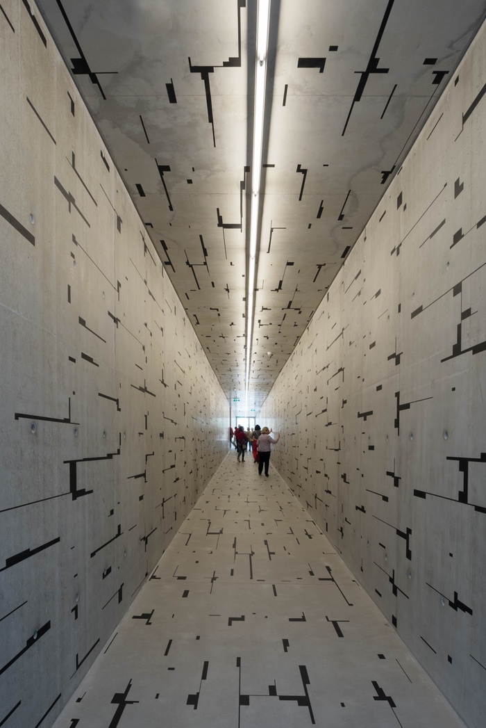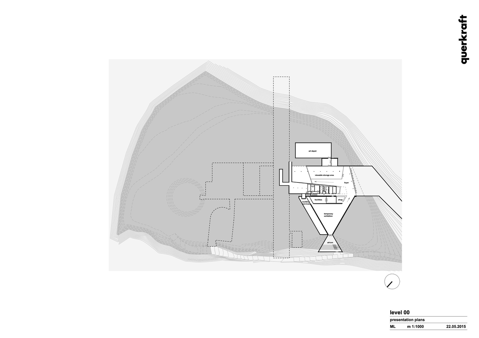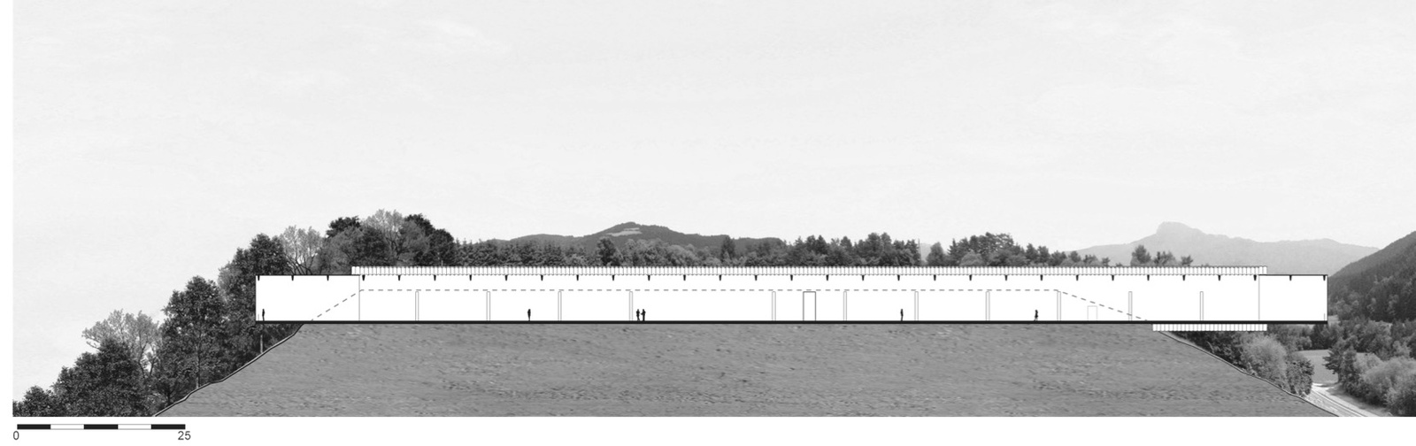 Das von querkraft architekten ZT GmbH entworfene Bauwerk ist als begehbare »Landart« konzipiert: ein 160 Meter langer Baukörper, weitgehend im Gelände verborgen und nur punktuell sichtbar. Nicht ausstellend, sondern einschreibend – in die Topografie, in Bewegungsabläufe und Denkprozesse. Rund 95 % des Volumens liegen unter der Erde – getragen von der Idee, die Sichtbarkeit von Architektur zu reduzieren und zugleich ihre Wirkung zu intensivieren.