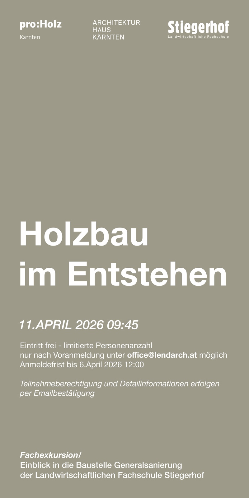 Fachexkursion📌 "HOLZBAU IM ENTSTEHEN", 11.04.2026, 09.45 Uhr, [Fach-]Exkursion. Geführte Baustellenbegehung zur Generalsanierung der LFS-Stiegerhof mit Einblicken in die Holzbauarchitektur und der Möglichkeit zum Austausch mit Fachpersonen.