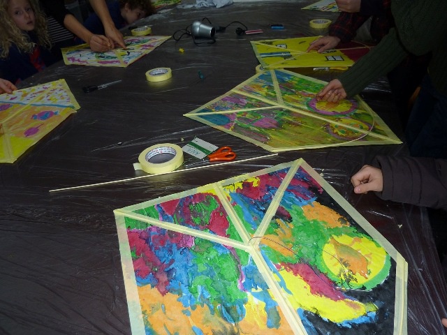 Wenn das Papier getrocknet ist, wird ein Gerüst aus Bambus auf die Rückseite geklebt. Anschließend wird Kreppapier, Waageschnüre und Flugleinen befestigt. Zum Abschluß zeigt der Flugtest, ob die Drachen-Häuser die Wolken kratzen.