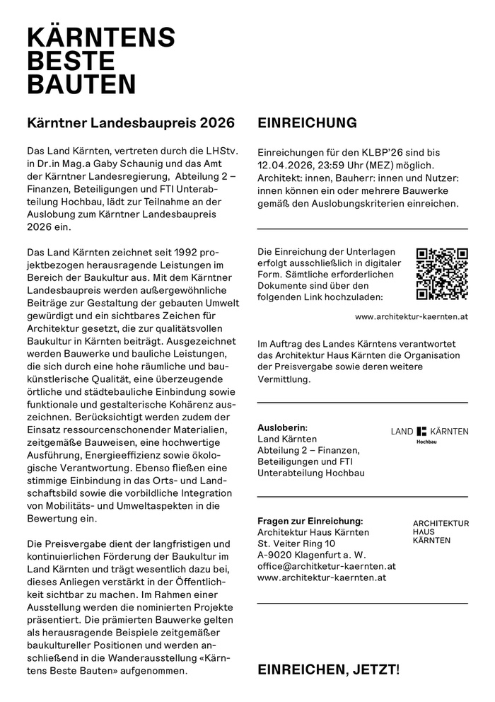 Das Land Kärnten, vertreten durch die LHStv.in Dr.in Mag.a Gaby Schaunig und das Amt der Kärntner Landesregierung, Abteilung 2 - Finanzen, Beteiligungen und FTI, Unterabteilung Hochbau, lädt zur Teilnahme an der Ausschreibung zum Kärntner Landesbaupreis 2026 ein.