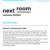 weiterlesen …Der Kärntner Landesbaupreis zeichnet die besten Bauten des Landes aus und blickt auf eine langjährige Geschichte zurück. Für besondere Leistungen im Bereich der Baukultur wird der projektbezogene Ehrenpreis seit 1992 vom Land Kärnten vergeben.