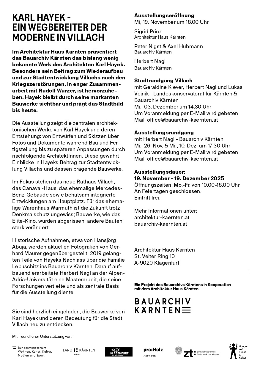 Ausstellung mit RahmenprogrammIm Architektur Haus Kärnten präsentiert das Bauarchiv Kärnten das bislang wenig bekannte Werk des Architekten Karl Hayek. Besonders sein Beitrag zum Wiederaufbau und zur Stadtentwicklung Villachs nach den Kriegszerstörungen, in enger Zusammenarbeit mit Rudolf Wurzer, ist hervorzuheben. Hayek bleibt durch seine markanten Bauwerke sichtbar und prägt das Stadtbild bis heute.
