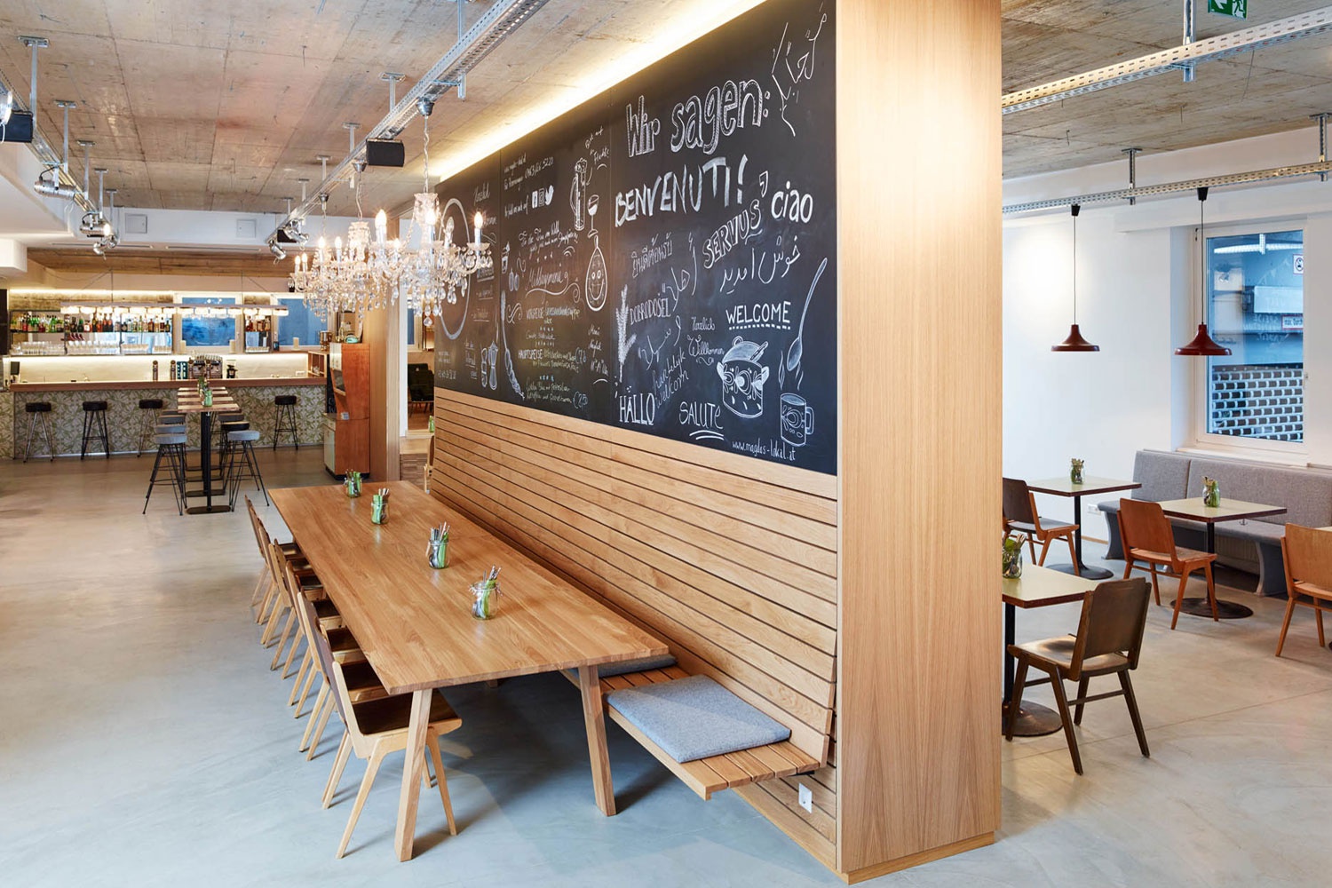 Den hallenartigen Charakter des Lokals versuchte der letzte Pächter, ein Grieche, durch griechische Säulen, Verzierungspaneelen und jeder Menge verbauter Sitzecken Herr zu werden. Da von Anfang an feststand, dass möglichst viel vom Bestand in upgecycelter Form verwendet werden sollte, galt es in einer Bestandsaufnahme das Verwertbare herauszuschälen und die Räume von überflüssigem Ziergut zu befreien. Puristisch und unter Verwendung einiger weniger Materialien und Farben wurde das Lokal in verschiedene Bereiche zoniert. Der weitläufige Raum wurde durch eine zentrale Holzwand geteilt, die als Rückenteil für eine lange Sitzbank einerseits und als Bücherregal andererseits dient. Zwei große Eichentische sind vor dem Raumteiler positioniert und sollen großen Gruppen Platz bieten, es aber auch ermöglichen, dass hier einzelne Gäste ins Gespräch kommen. Auf der großen Tafelfläche darüber, ist das tägliche Mittagsmenü und auch sonst so einiges angeschrieben. Die Rückseite wird zu einem überdimensionalen Wohnzimmerregal voller Bücher. Hier lässt es sich schmökern und stöbern. Für Veranstaltungen kann aus der Holzwand eine raumhohe Schiebetür geschoben werden und der Gastraum kurzerhand in einen Zuschauerraum verwandelt werden. Das Bühnenpodest kann bei normalem Betrieb zum Sitzen verwendet werden und wird über Eck zu einem Loungebereich mit gemütlichen Sofas. Bestandseckbänke wurden neu tapeziert und gestrichen und bilden nun gemütliche Sitznischen. Weitere Sitzbereiche sind als Inseln in den Raum gestellt. Der Barbereich wird durch Zementfliesen und ungenutzte Stiegenhausbeleuchtungskörper charakterisiert.