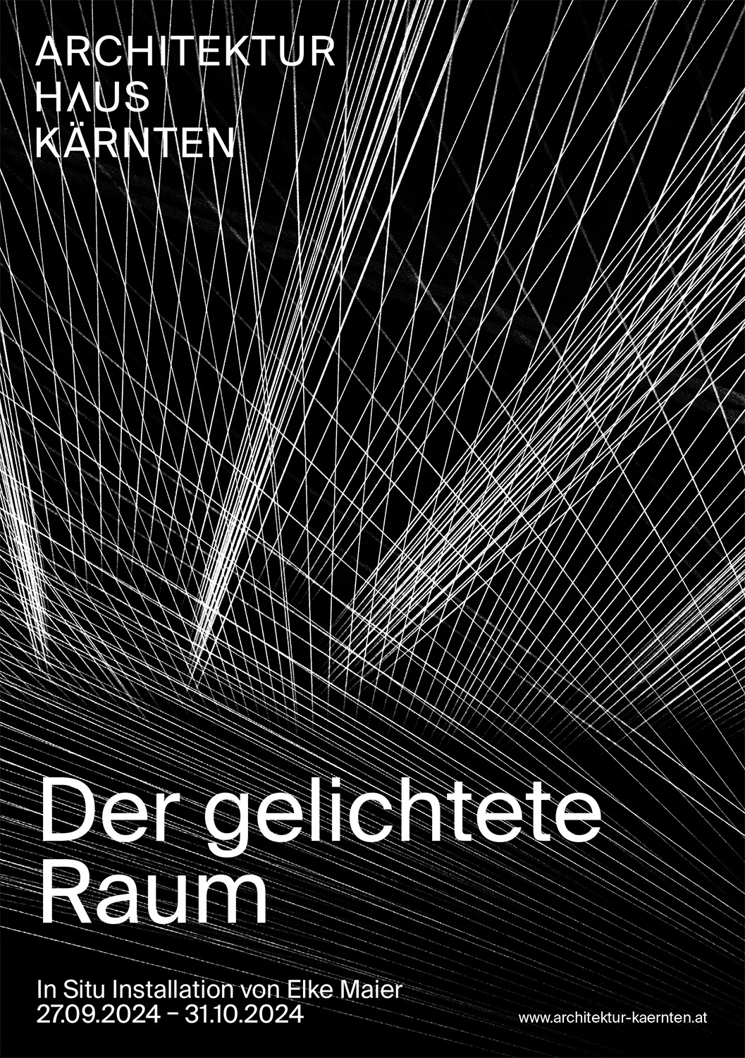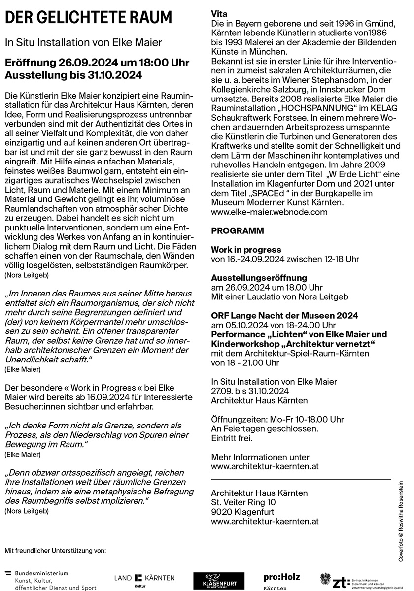 Die Künstlerin Elke Maier konzipiert eine Rauminstallation für das Architektur Haus Kärnten, deren Idee, Form und Realisierungsprozess untrennbar verbunden sind mit der Authentizität des Ortes in all seiner Vielfalt und Komplexität, die von daher einzigartig und auf keinen anderen Ort übertragbar ist und mit der sie ganz bewusst in den Raum eingreift. Mit Hilfe eines einfachen Materials, feinstes weißes Baumwollgarn, entsteht ein einzigartiges auratisches Wechselspiel zwischen Licht, Raum und Materie. Mit einem Minimum an Material und Gewicht gelingt es ihr, voluminöse Raumlandschaften von atmosphärischer Dichte zu erzeugen. Dabei handelt es sich nicht um punktuelle Interventionen, sondern um eine Entwicklung des Werkes von Anfang an in kontinuierlichem Dialog mit dem Raum und Licht. Die Fäden schaffen einen von der Raumschale, den Wänden völlig losgelösten, selbstständigen Raumkörper. (Nora Leitgeb)