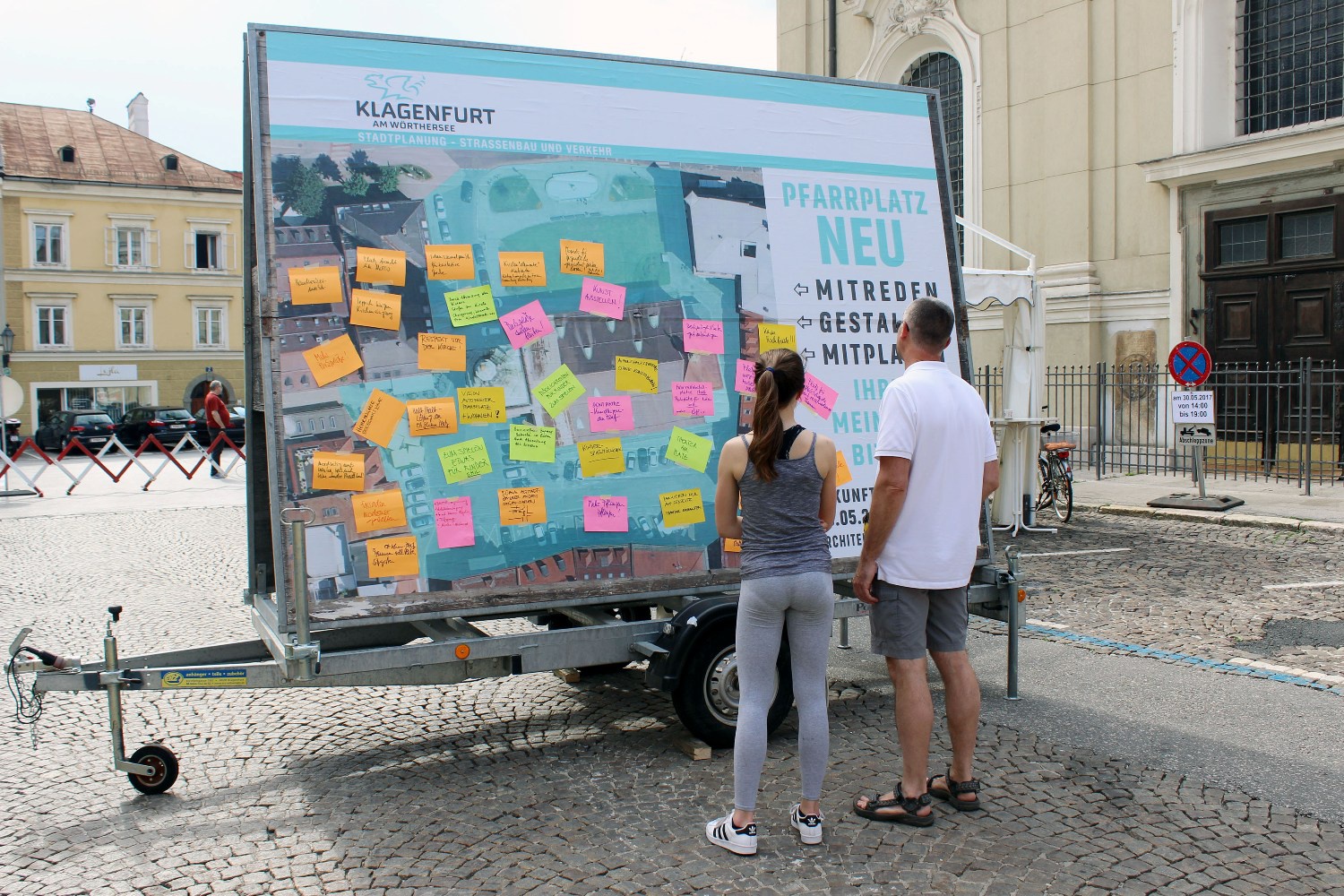 Dem Bewerb vorangegangen ist ein intensiver Bürgerbeteiligungsprozess, bei dem Anrainer und Bevölkerung ihre Vorstellungen deponieren und diskutieren konnten. Unter anderem gab es direkt auf dem Pfarrplatz auch eine große Pinwand, wo man seine Wünsche anbringen konnte. Insgesamt gab es 278 Rückmeldungen.