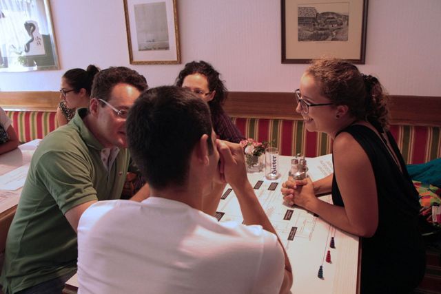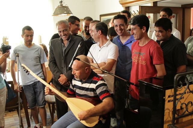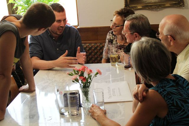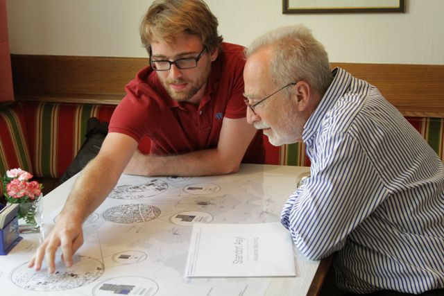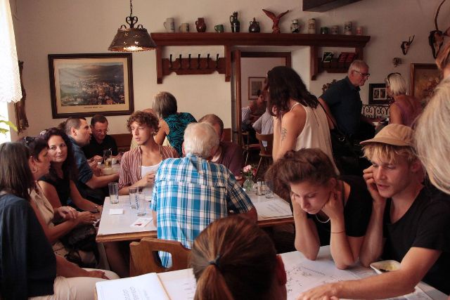 Die Gasthausschank und der Garten füllten sich mit Interessierten, die den Begrüßungsreden von Anny Knapp der Asylkoordination Österreich, den KuratorInnen der Wanderausstellung Nina Valerie Kolowratnik und Johannes Pointl sowie Elisabeth Steiner als Gastgeberin und Betreiberin des „offenen“ Bärenwirtes folgten und sich über die syrische Musikeinlage der neuen Gäste erfreuten. Danach konnten sich die BesucherInnen zu den Gasthaustischen setzen, auf denen die Ausstellungsplakate angebracht wurden. Die Studierenden stellten ihre raumanalytischen Kartographien und kritisch-argumentativen Essays persönlich vor, die sich mit unterschiedlichen Maßstäben der Flucht in Österreich beschäftigen und noch bis mindestens September zu sehen sein werden.