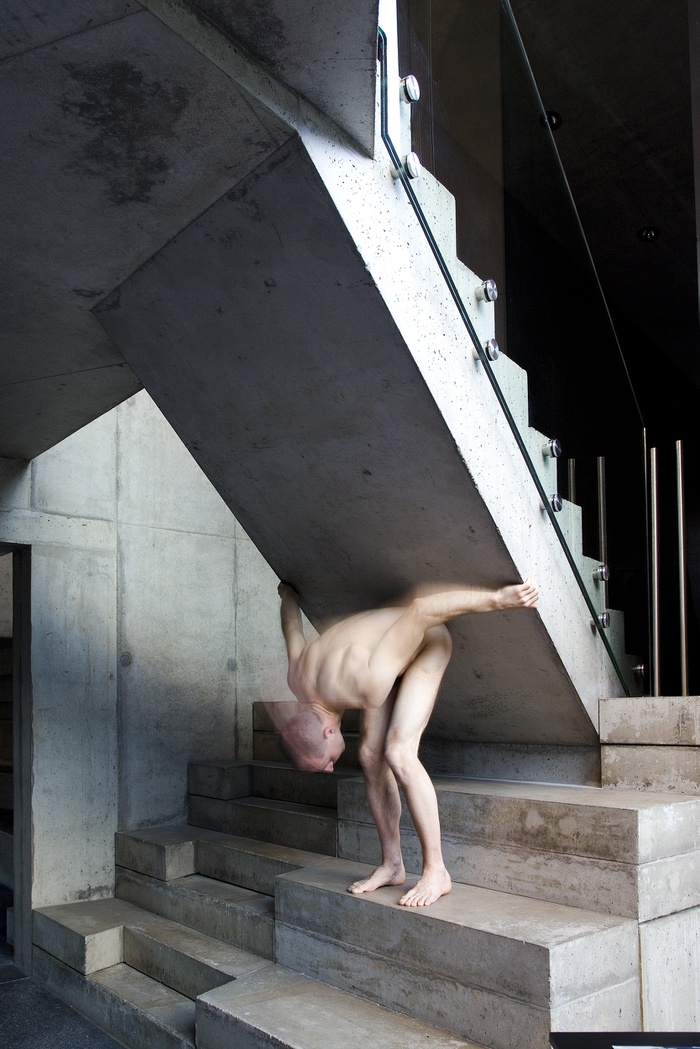 Matthias Mollner eröffnet die neue Performancereihe „Under de-Construction“, indem er sich körperlich-performativ auf die polymorphe Gestalt des Domenig Steinhaus einlässt: „Die Kammern, Treppen, Gänge und Schächte des Gebäudes werden in der Performance auf zeitlicher und räumlicher Ebene miteinander verknüpft. Ein Körper geht durch diese Ebenen hindurch, transformiert sich selbst und den Raum um ihn herum. Krümmt, was zu gerade erscheint. Gemeinsam mit dem Publikum bewegt sich der Körper durch die verschiedenen Ebenen und wird zum Gedanken, zur Nahrung, zum Eingeweide des Hauses.“