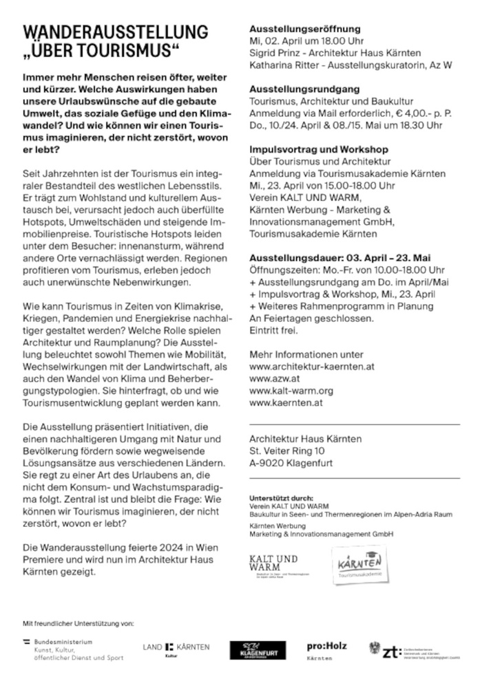 Anmeldung Workshop Tourismusakademie via Webseite: https://www.kaernten.at/b2b/wissen-innovation/die-tourismusakademie/veranstaltungen/KTN/6270f9fa-376b-46e0-89cc-319d3b693c9b/ueber-tourismus-und-architektur