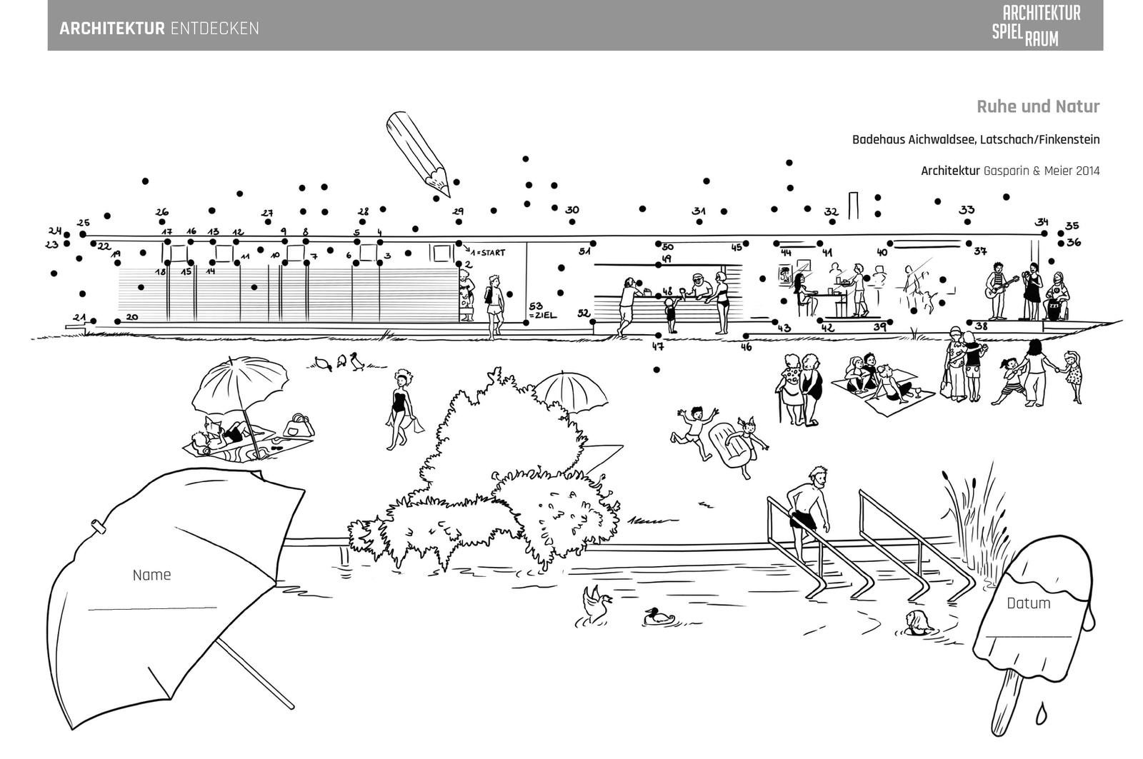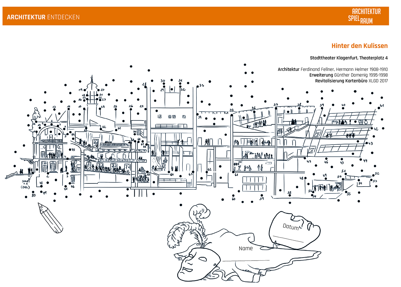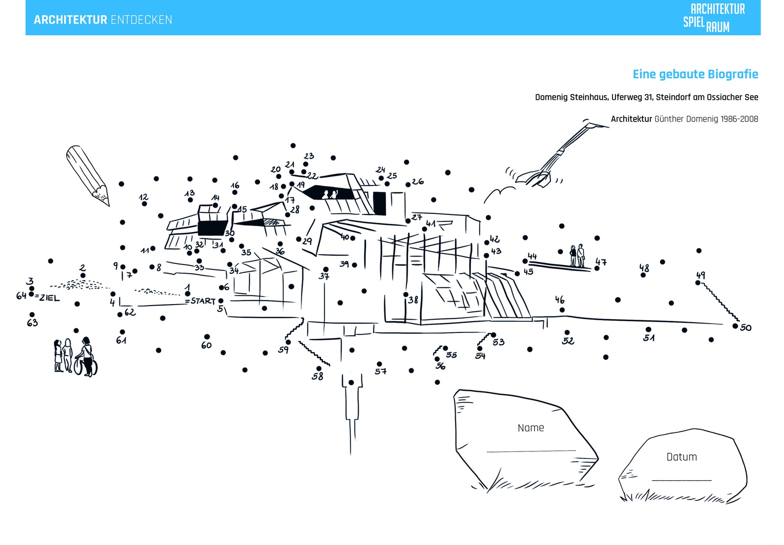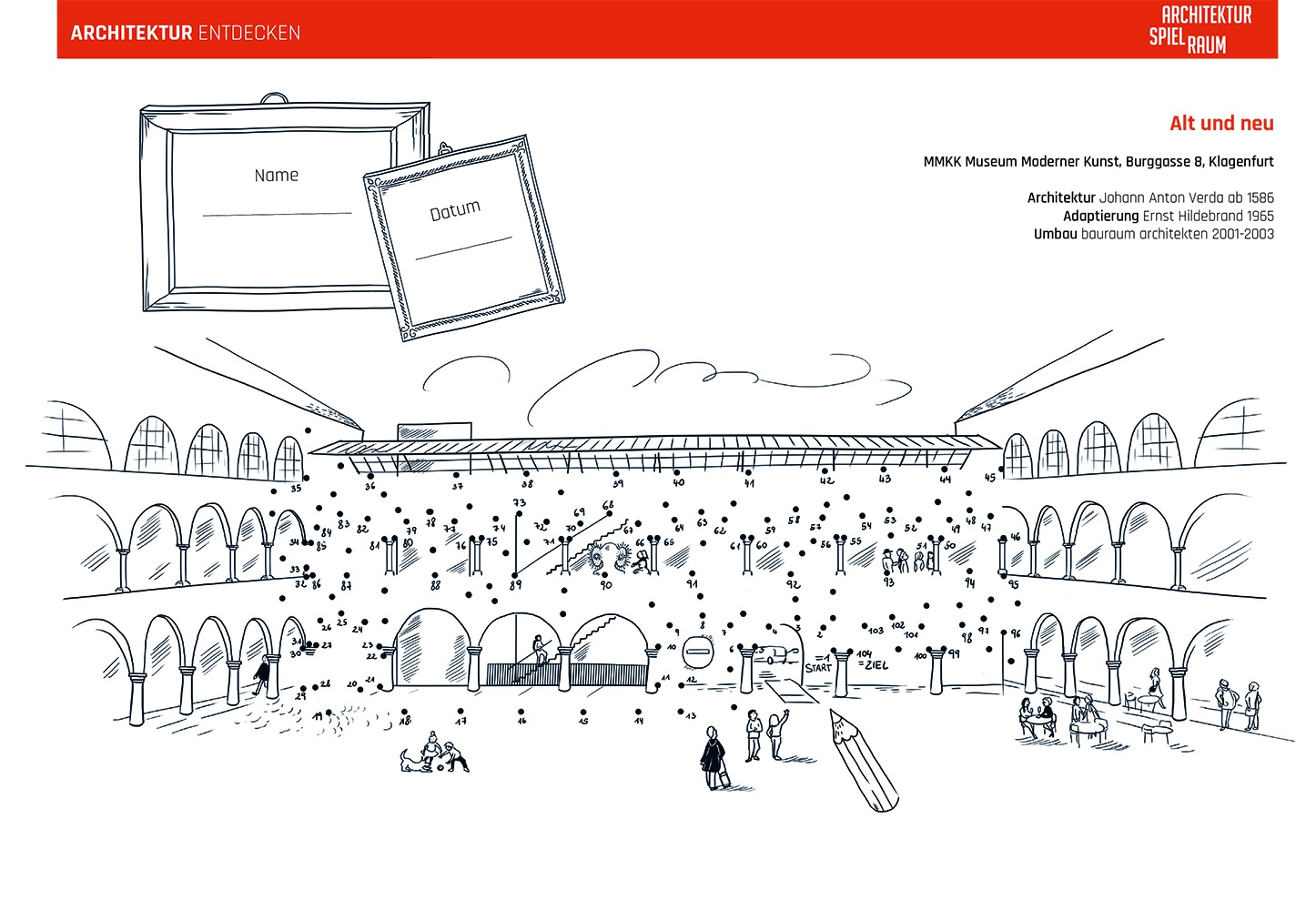 Die Arbeitsblätter können als Vermittlungsinstrument in Schulen und baukulturellen Institutionen eingesetzt werden und sollen zum Besuch der jeweiligen Bauwerke anregen. Die ansprechend gestalteten Karten laden Baukulturvermittler*innen, Jugendliche, Kinder, Pädagog*innen und Schulklassen zum Mitmachen ein: Kurze geschichtliche Informationen zur Entstehung des Bauwerks, Besonderheiten, Materialkunde und interessante Eckdaten wechseln sich mit konkreten Fragestellungen und Hinweisen auf weiterführende Literatur ab. Ein spannendes Punkt-zu-Punkt Bild ermöglicht es, das Bauwerk auch mit dem Stift zu „entdecken“ und die Scheu vor dem Selber-Zeichnen zu überwinden.