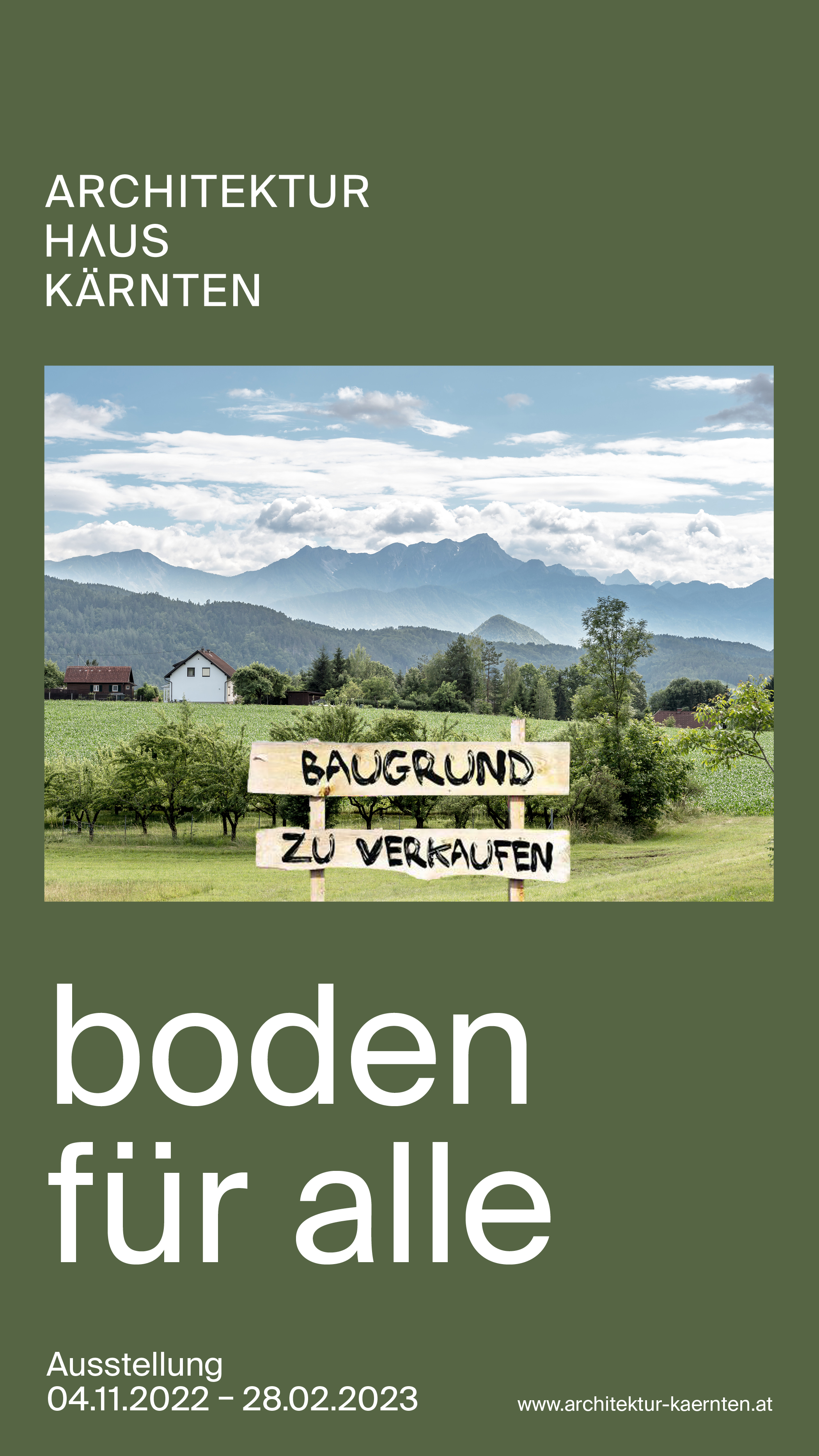 Das Architektur Haus Kärnten startet bereits im November 2022 mit dem neuen Schwerpunkt „Grund und Boden“ in die kommenden zwei Programmjahre. Mit der Ausstellung „BODEN FÜR ALLE“ von Architekturzentrum Wien werden anschaulich und konkret brandaktuelle Hintergründe zum Bodenverbrauch geliefert. Ein umfassendes Rahmenprogramm schafft eine Vernetzung mit regionalen Themen in Kärnten. Ein eigenes Kärnten-Modul mit den Baukulturellen Leitlinien und damit verbundenen Aktivitäten wurde für die Ausstellung erarbeitet.Die Ausstellung in Kärnten wird begleitet von einem vielfältigem Rahmenprogramm aus Vorträgen, Workshops, Führungen, Vermittlungsprogramm für Schulen, Kurzfilmen, Gesprächen und einer Tagung.