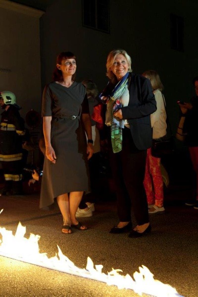 Zur Eröffnung der Installation ist eine Feuerlinie zwischen FIRE und WATER entflammt. Die Aktion schaffte einen Erlebnisraum für die BesucherInnen und band den lokalen Feuerschutz in das Kunstprojekt ein. In Zusammenarbeit mit der Klagenfurter Feuerwehr wurde eine kontrollierte Brandlinie durch den Park gelegt und im Zuge einer feierlichen Zeremonie von der Bürgermeisterin, Dr. Maria-Luise Mathiaschitz, entzündet. Zuerst erleuchtete die Neonschrift FIRE, dann entzündete sich die Feuerlinie, das Feuer bewegte sich durch den Park (Foto 1-3) und löste schließlich das Erleuchten des Schriftzugs WATER auf der gegenüberliegenden Fassade aus (Foto 4).