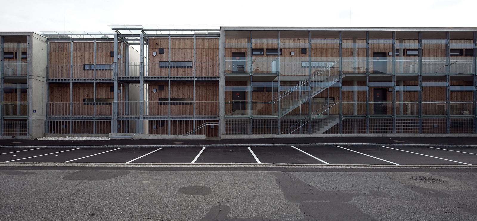 „Die Wohnanlage mit 95 Wohnungen im Zentrum von Klagenfurt wurde mit dreigeschoßigen Baukörpern in geschickter Gliederung angeordnet. Holz hat einen Drittel-Anteil bei der in Mischbauweise errichteten Siedlung. Vorgefertigte Großtafelelemente mit Fassaden aus Weißtanne und Lärche schaffen einen wohnlichen Eindruck, gutes Raumklima und lockern das Gesamtbild. Gut überlegte Details und die unbehandelte Holzfassade sorgen für lange Wartungs-Intervalle und niedrige Kosten. Der Bau wirkt durch das Holz auf den Betrachter zeitlos und doch modern."
