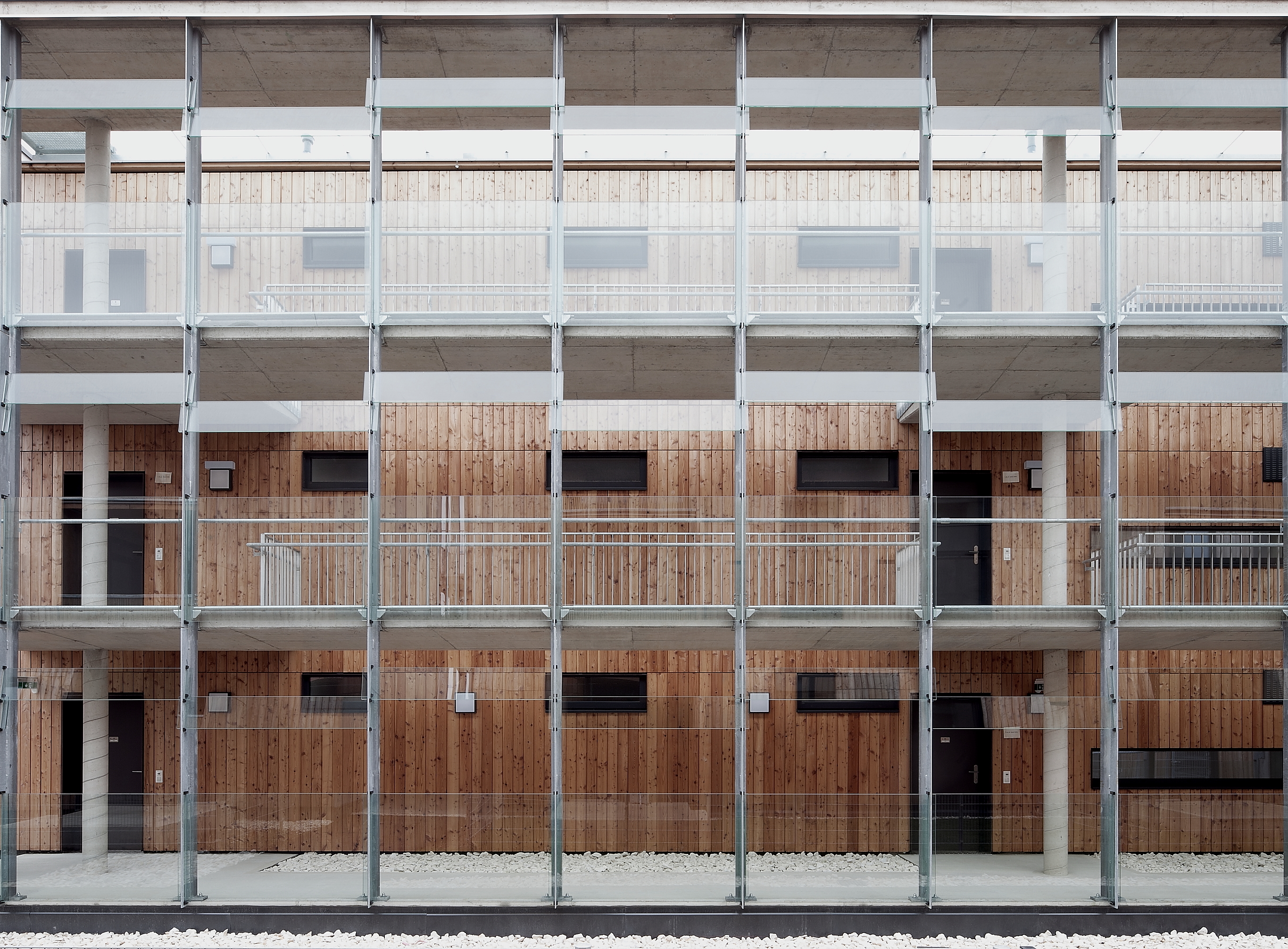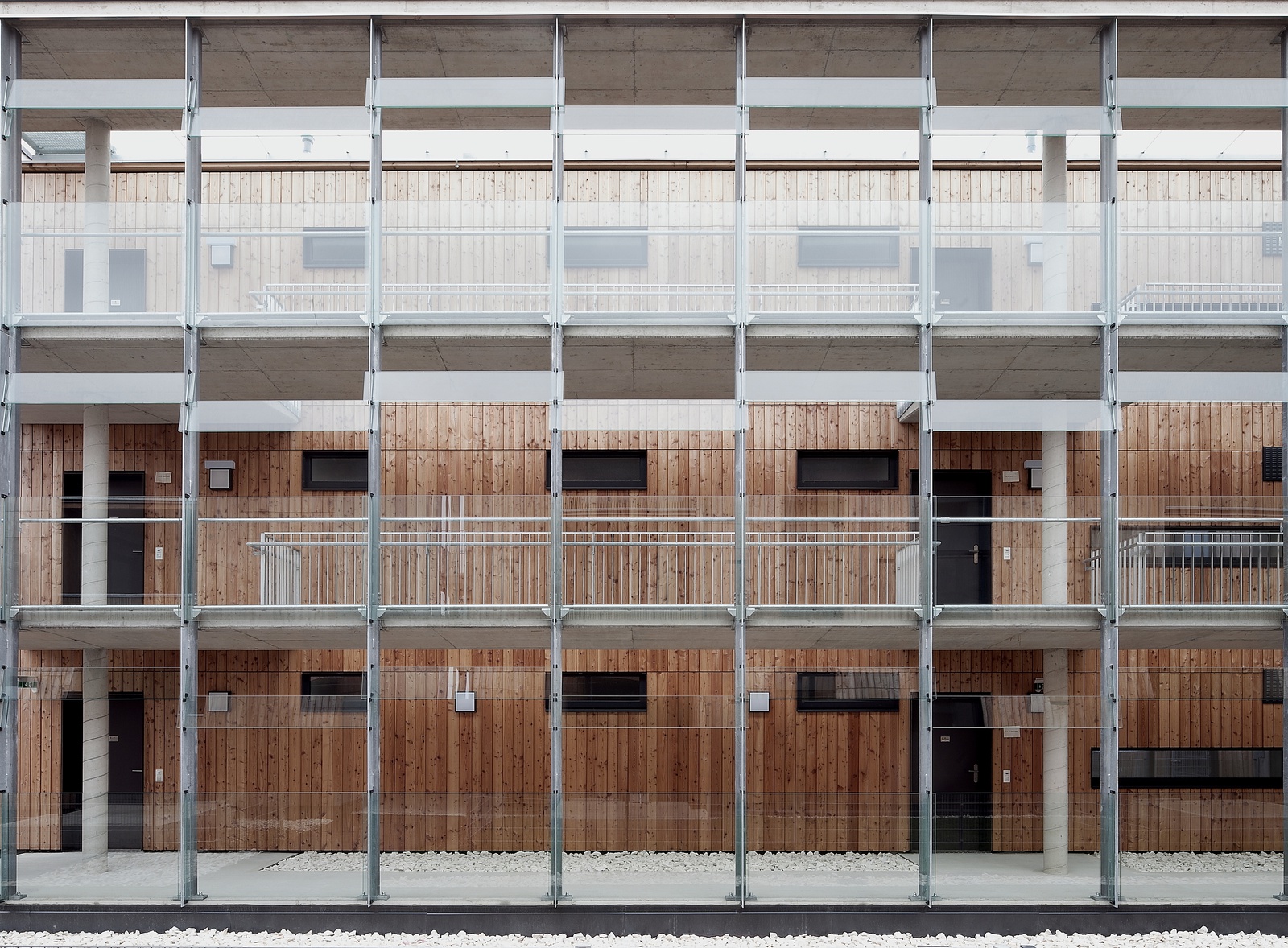 Die Architekten wollten mit der Anlage in Klagenfurt keinen Wohnbau in der Stadt, sondern eine Stadt, die bewohnt ist, schaffen. Daher sind die einzelnen Einheiten entlang von Straßen angeordnet, kleine Blöcke in Mischbauweise, zu Zweier- und Dreiergruppen zusammengeschlossen. Jede einzelne Wohnung ist von außen erschlossen, man kommt sozusagen vom Gehsteig direkt in die eigenen vier Wände. Holzflächen prägen die Eingangs- und die Loggien-Bereiche.