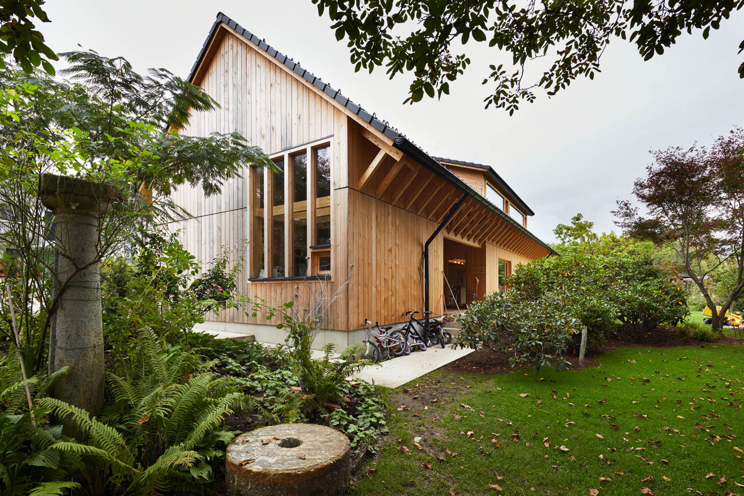 Die Jungfamilie mit drei Kindern wollte ein kleines, kompaktes Haus und bevorzugte wegen der hohen Wohnqualität einen Holzbau. Das Konzept nimmt mit dem großen, gedeckten Freiraum Bezug auf den großen Garten mit dem alten Baumbestand und bezieht ihn so in den Wohnbereich ein.