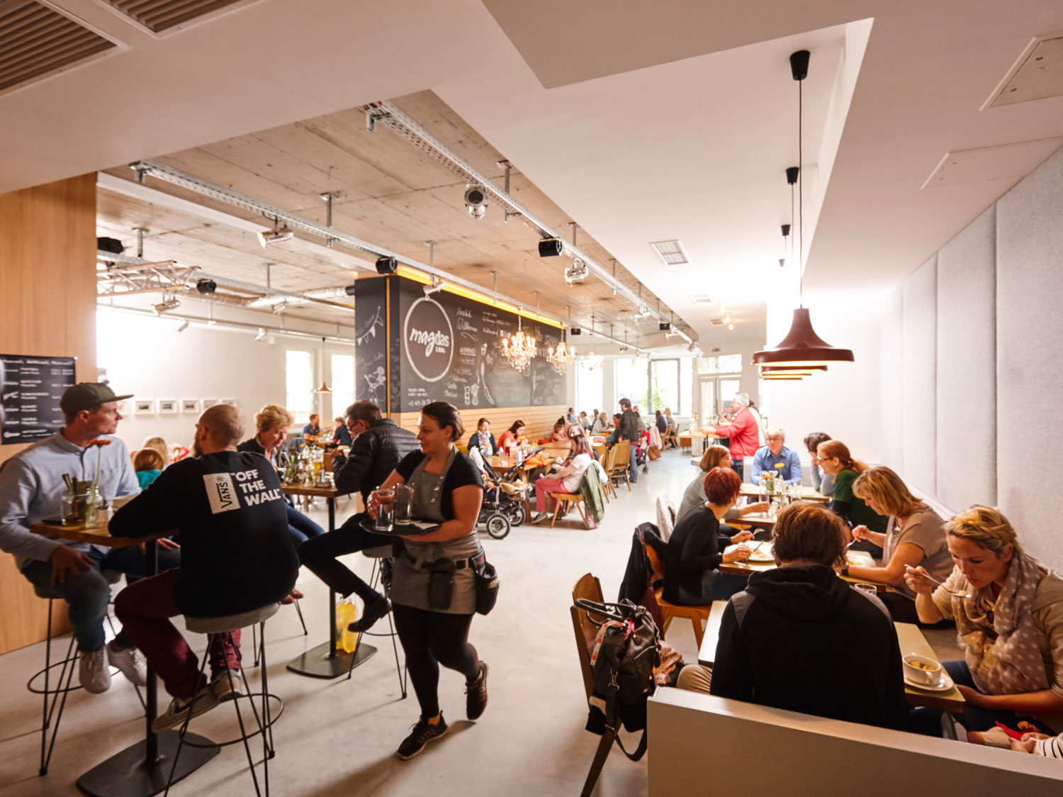 Magdas mag man eben. Die Zeit ist reif für urbane Gastronomiekonzepte mit unverwechselbarem Flair, die auf Kooperationen, vorhandenen Ressourcen und gesellschaftlichen Visionen aufbauen, so auch in Klagenfurt. 2015 initiierte die Caritas Kärnten ein gastronomisches Ausbildungsprojekt für anerkannte Asylwerber und Menschen mit Migrationshintergrund in einer eigenen, leerstehenden Immobilie. So integrativ der Ansatz und knapp bemessen die Mittel, so kreativ war in Folge die Konzeption - von Auftraggebern, Bewirtungsteam und Architekten von Anbeginn an gleichermaßen entwickelt. Transformieren des Bestandes mit minimalem Materialeinsatz und maximaler atmosphärischer Verdichtung erscheint die Devise, ähnlich dem zuvor in Wien realisierten, gleichnamigen Hotelkonzepts.