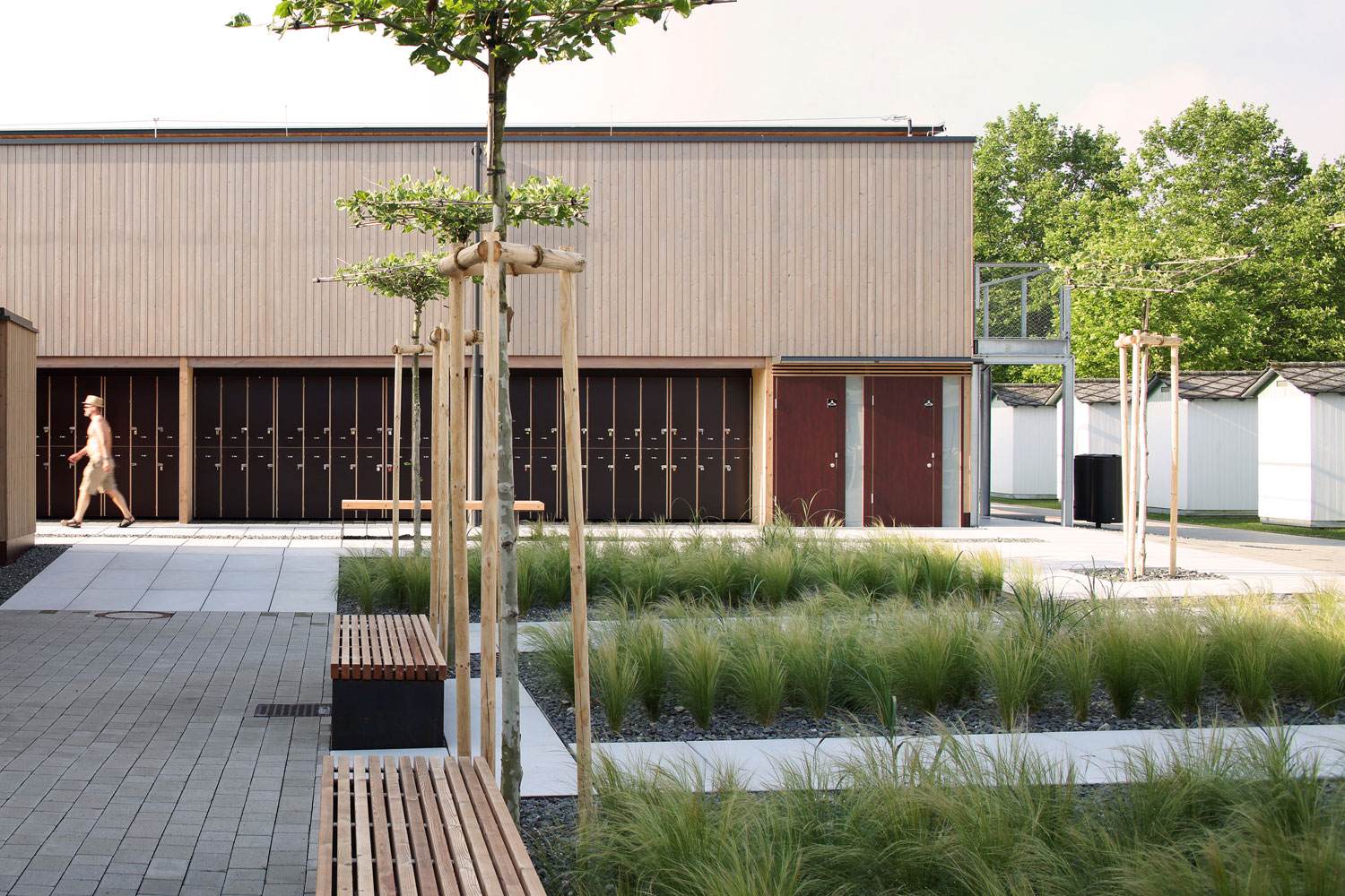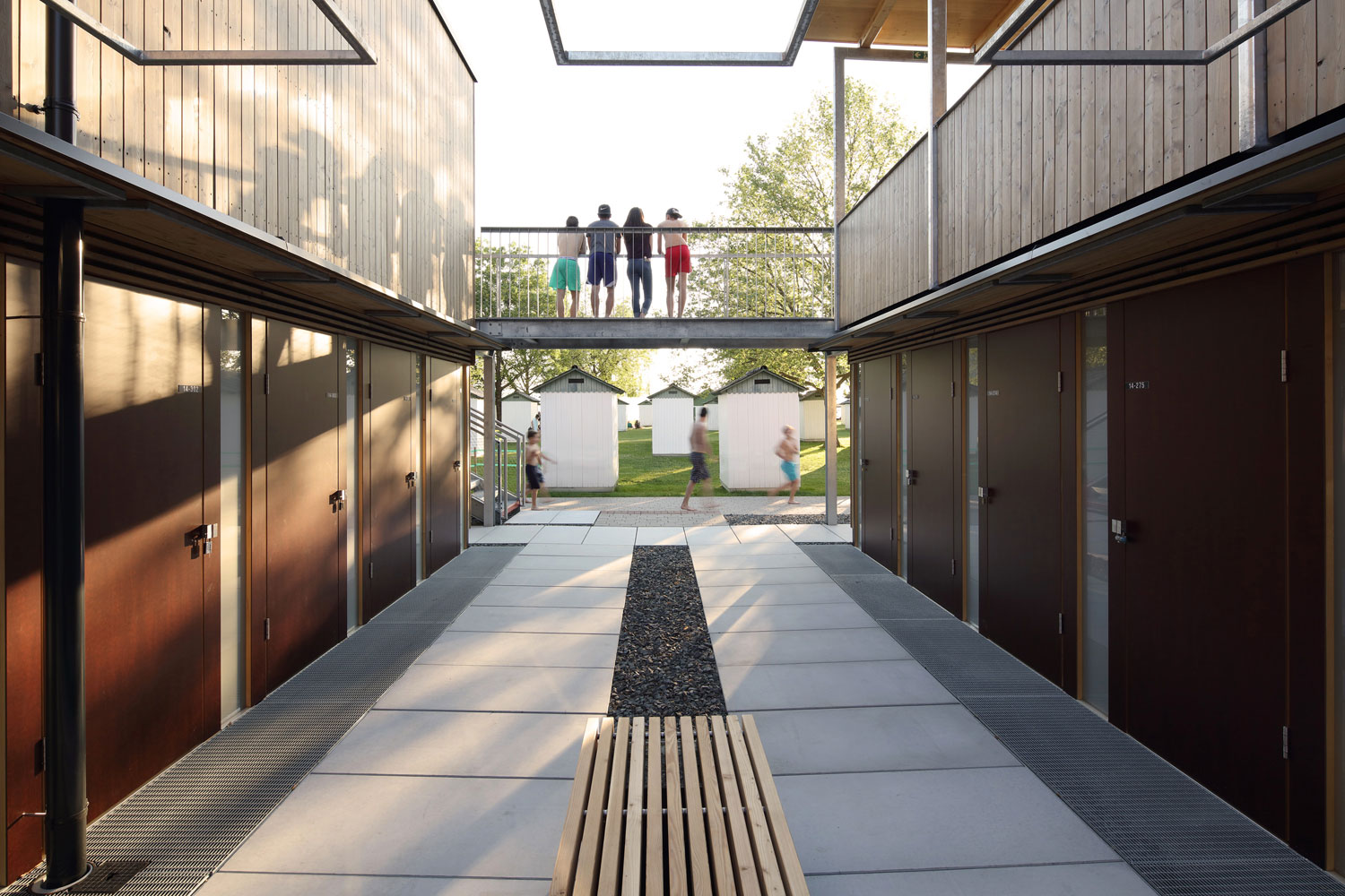 Aus der Vogelperspektive wirkt der neue, regelmäßig gegliederte Trakt, ein Ersatzbau für die zwei in die Jahre gekommenen Hofbauten, wie die logische Weiterführung einer vorhandenen Partitur. Die zweigeschoßigen Riegel mit dem aufgestockten Angebot an Umkleidekabinen und Kästchen umfassen u-förmige, maßstäblich angenehme Höfe, sie reagieren in der Geste kraftvoll auf die in Weiß abstrahierten Badehäuschen in Holz. Diese sind mit großer Nonchalance in Zeilen auf die Rasenfläche gestreut, dazwischen markieren prächtige Einzelbäume die Tonsprünge im Bestand und erzeugen eine einzigartige Atmosphäre.