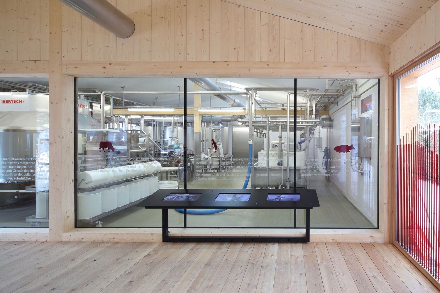 Die Typologie der Lab’n, dem ost-west-orientierten, durchgesteckten Kaltraum, wurde dem Kärntner Bauernhaus der Nockberge entlehnt und zum zentralen, zweigeschoßigen Erschließungsraum abgewandelt. Wenngleich das Durchhaus nicht zwangsläufig dem Ort entspricht, ermöglicht es Einblicke in die hochtechnologisierten Produktionsprozesse, lenkt in die helle Imbiss- und Verkaufsstube in Holz und führt hinab zu Lagerpflege und anregend einfachen Wissensvermittlung rund um Kuh, Käse und Milchwirtschaft im interaktiv wirksamen, analogen Schubladenschrank. Ortsbaulich markiert der Längsbaukörper die Einfahrt zum Ortszentrum, gestalterisch wurde die Aufgabe bis ins kleinste Detail durchdacht und angemessen ausformuliert, die funktionellen Abläufe sind optimiert und gut ablesbar, die Materialisierung in Holz ist CO² neutral und manifestiert das Bio-Thema durch und durch.