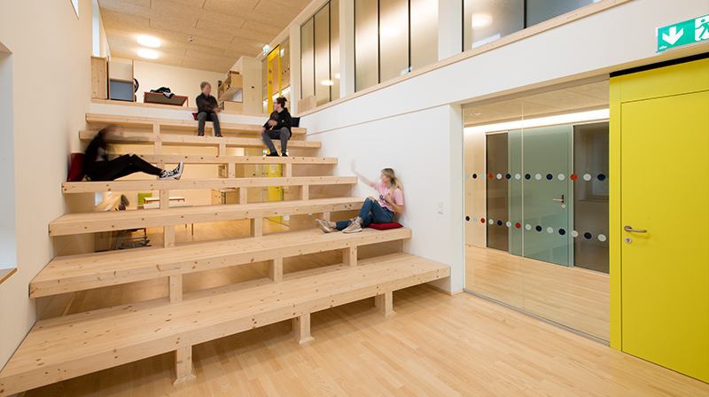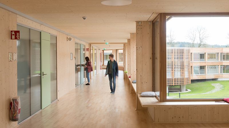 Konstruktiv wurde die Massivholzbauweise in Sicht gewählt, die konsequent bis ins Detail und auch in der Einrichtung ablesbar ist. Atmosphärisch vermittelt das Gebäude Geborgenheit, Lebendigkeit und ist für die Schülerinnen und Schülern sicher eine zweite Heimat.“