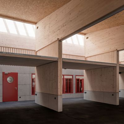 Im introvertierten und überdeckten Innenhofbereich bekleidet eine einfache und naturbelassene Holzbretterfassade die tragende Riegelkonstruktion, im Außenbereich zur Straße hin eine kosteneffiziente anthrazitfarbene Trapezblechfassade, welche den Holzbau vor Wind und Wetter schützt.