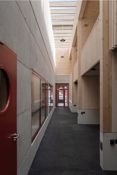 Das Einsatzzentrum, ein Hybridbau aus Stahlbeton und Holzmassivbau, wird über zwei Zugänge bespielt. Der Zugang zu den Gruppenräumen und Büros an der Längsseite des Gebäudes kommuniziert mit dem zukünftigen Gemeindezentrum und bildet einen Raum für gemeinsame Aktivitäten. Die Zu- und Ausfahrt der Einsatzfahrzeuge ist um 90 Grad versetzt und ermöglicht eine schnelle und direkte Zufahrt bei Einsätzen zur Bundesstraße. Im Inneren gibt es klare und übersichtliche Raumzuteilungen für die jeweilige Einsatzorganisation und trotzdem die Möglichkeit der gemeinsamen Nutzung.